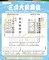 河竹黙阿弥 作 加賀山直三 補綴 通し狂言 加賀見山再岩藤(かがみやまごにちのいわふじ) 骨寄せの岩藤 発端 多賀家下館奥庭の場 序幕 浅野川々端多賀家下館塀外の場 浅野川々端の場 浅野川堤の場 二幕目 八丁畷三昧の場 花の山の場 三幕目 多賀家奥殿草履打の場 四幕目 鳥井又助内切腹の場 大詰 多賀家下館奥庭の場 岩藤の霊/鳥井又助 尾上 松 緑(Bプロ) 坂東 巳之助(Aプロ) 二代目尾上 中村 萬 壽(Bプロ) 中村 時 蔵(Aプロ) 花房求女 中村 萬太郎 梅の方 坂東 新 悟 花園姫 市川 男 寅 安田の若党勝平 中村 虎之介 又助妹おつゆ 中村 莟 玉 蟹江主税 中村 歌之助 又助弟志賀市 中村 種太郎 奥女中宮越 中村 歌女之丞 奥女中関屋 澤村 宗之助 蟹江一角 坂東 亀 蔵 松浪主計 中村 松 江 望月弾正 中村 芝 翫 お柳の方 中村 扇 雀 安田帯刀 中村 又五郎 多賀大領 七代目尾上 菊五郎 ******************************************************** 【夜の部】 今井豊茂 作 一、壽春鳳凰祭(いわうはるこびきのにぎわい) 帝 中村 梅 玉 女御 中村 雀右衛門 大臣 坂東 彦三郎 大臣 中村 歌 昇 女御 坂東 新 悟 大臣 大谷 廣太郎 女御 中村 種之助 大臣 中村 橋之助 女御 市川 男 寅 女御 市川 門之助 女御 市川 高麗蔵 大臣 河原崎 権十郎 女御 市村 萬次郎 大臣 大谷 友右衛門 女御 中村 魁 春 河竹黙阿弥 作 通し狂言 二、三人吉三巴白浪(さんにんきちさともえのしらなみ) 序幕 大川端庚申塚の場 二幕目 割下水伝吉内の場 本所お竹蔵の場 三幕目 巣鴨吉祥院本堂の場 裏手墓地の場 元の本堂の場 大詰 本郷火の見櫓の場 浄瑠璃「初櫓噂高音」 和尚吉三 尾上 松 緑(Aプロ) 坂東 巳之助(Bプロ) お嬢吉三 中村 時 蔵 お坊吉三 中村 隼 人 手代十三郎 市川 染五郎 伝吉娘おとせ 尾上 左 近 堂守源次坊 中村 吉之丞 釜屋武兵衛 市村 橘太郎 八百屋久兵衛 嵐 橘三郎 長沼六郎 市川 男女蔵 土左衛門伝吉 中村 歌 六 |